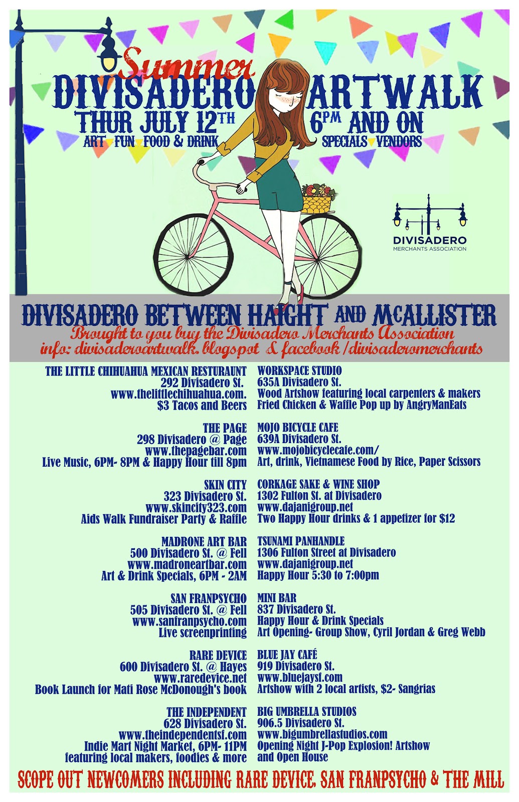 We are super happy to welcome some newbies to the block(s) that will join in this artwalk including Gallery/ Store- Rare Device, Rad Screenprinters- San Franpsycho, Workspace & you can catch a preview of The Mill, which opens in August with Four Barrel/Josey the Baker (helllooo...awesome fresh bread and killer coffee). We'll host several food pop ups inside and outside, a Food Truck or two, artshows EVERYWHERE and a Mini Indie Mart at The Independent featuring 25 LOCAL vendors, foodies and makers. Come on out and scope all the goodness Divisadero has.